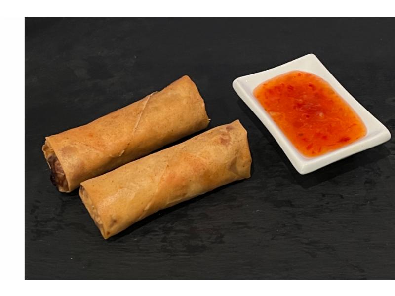 Store og sprøstekte vårruller med kyllingkjøtt og grønnsaker, severes med sursøt chilisaus | G, E