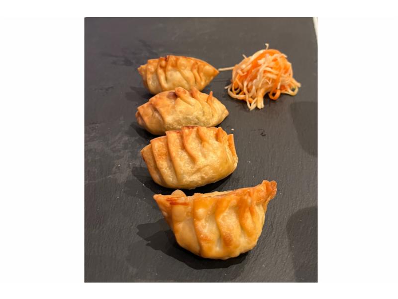 Friterte japanske dumplings fylt med kyllingkjøtt og grønnsaker, severes med sursøt chilisaus | G, E