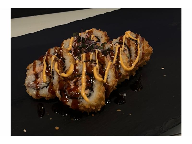 Laks og purreløk, frityrstekt helerull, chilimasjones og teriyakisaus | F, G