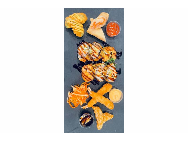 2 kylling gyoza, 2 tempura avokado, 2 tempura scampi, 1 kylling vårrull, 6 biter futomaki Hot special | G